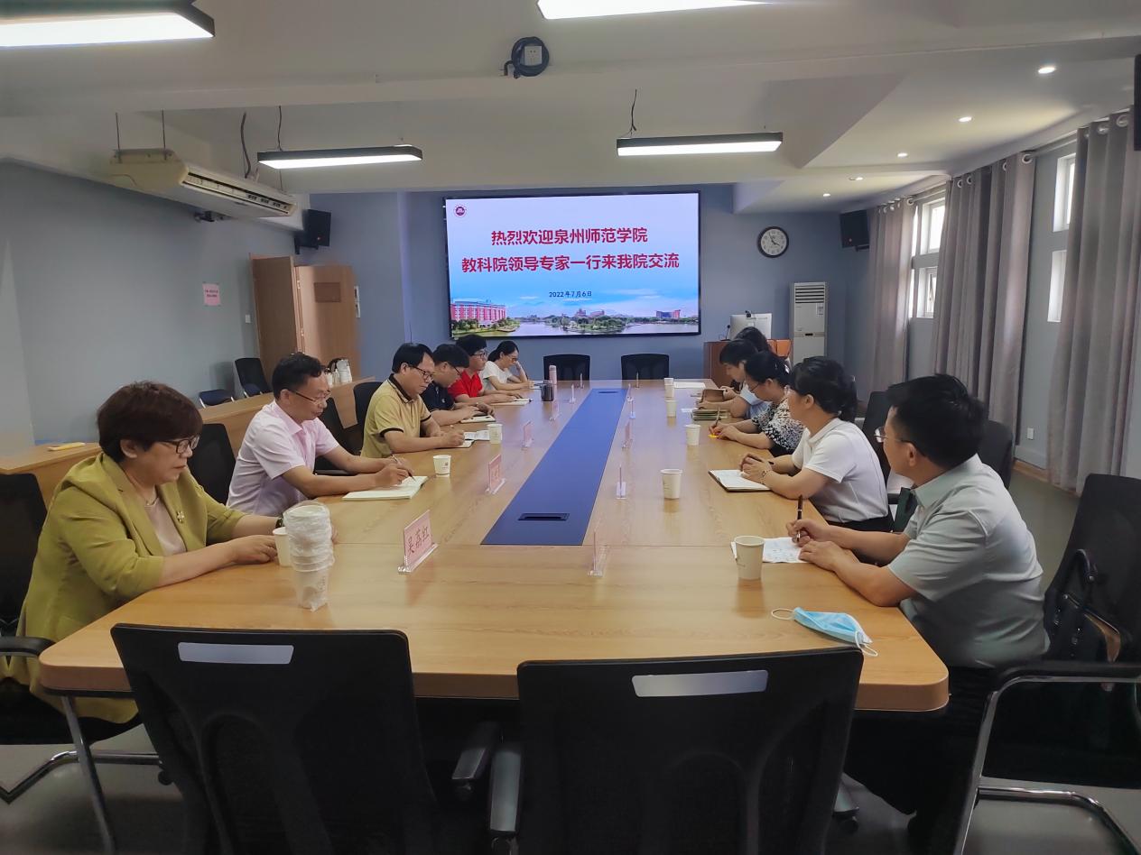 2022年7月6日,泉州师范学院教育科学学院院长雷培梁带队到我院走访交流,副院长曾雅茹、邵华和特殊教育系、学前教育系相关教师陪同参加。我院党委书记林伟川、党委副书记黄锦生、副院长殷世东和王伟宜、学前教育系主任吴荔红等热情接待。