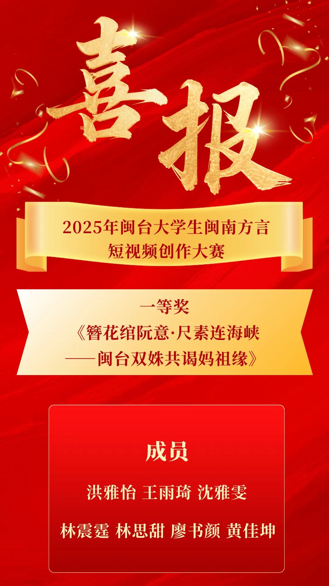 近日,在2025年闽台大学生闽南方言短视频创作大赛中,我院学子携手创作的《簪花绾阮意·尺素连海峡——闽台双姝共谒妈祖缘》在众多优秀短视频作品中脱颖而出,荣获2025年闽台大学生闽南方言短视频创作大赛一等奖!