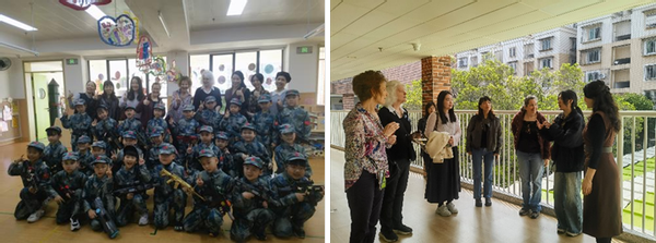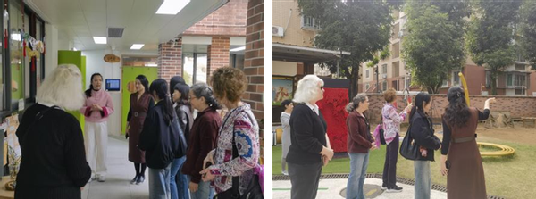 在园方与我院教师的引导下,匹兹堡州立大学教师代表团一行实地走访了教学活动室、特色活动区、户外游戏场地等场所,了解了幼儿园特色的儿童哲学课程,并深入班级与幼儿友好互动,沉浸式感受园所“行是知之始,知是行之成”的办园理念。