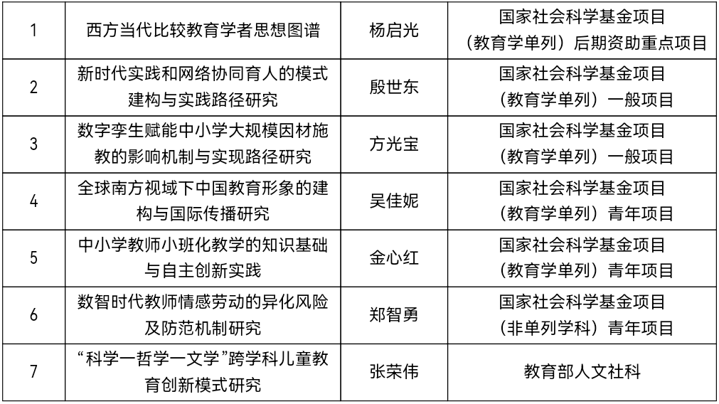 其中,杨启光教授主持的《西方当代比较教育学者思想图谱》成功获批国家社会科学基金后期资助重点项目,这一成果标志着我院在国家级重点科研项目申报领域取得关键性突破,既彰显了学院在比较教育学科的深厚学术底蕴,也凸显了我院科研成果的高质量与广泛影响力。与此同时,学院在一般项目与青年项目上持续深耕,构建起结构合理、梯次分明的科研人才队伍,展现出学科科研工作可持续发展的强劲势头。