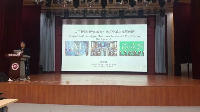 人工智能浪潮席卷各行各业,教育领域正积极探索与AI“为友” 的路径,借助数智力量提升教学科研效率、推动教育高质量发展。为让我院师生将人工智能与教育、科研高效融合,12月12日下午,我院特邀华东师范大学终身教授、教育技术学博士生导师祝智庭教授于仓山校区科学会堂开展“人工智能时代的教育:范式变革与实践创新”专题讲座。本次讲座由教育技术系主任杨宁教授主持,学院部分本科生、研究生及教师代表参与聆听。