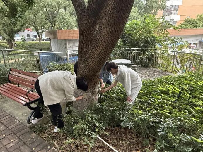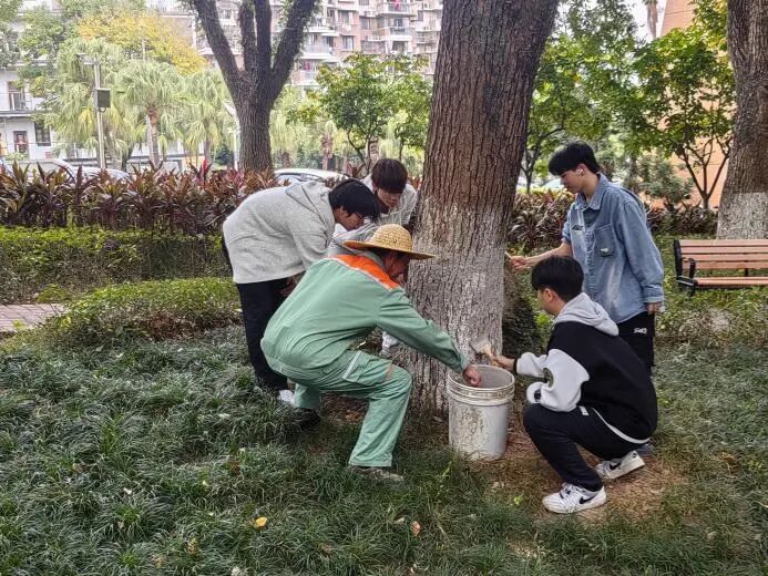 活动采取“技能学习+实地实践”的育人路径。前期,支部特邀校园园林专业师傅开展技术指导,系统讲解草木灰防虫防寒的科学原理,现场演示涂刷工艺与操作规范。支部成员认真学习、细致观摩,掌握树木养护的专业技能,为后续实践打下坚实基础。