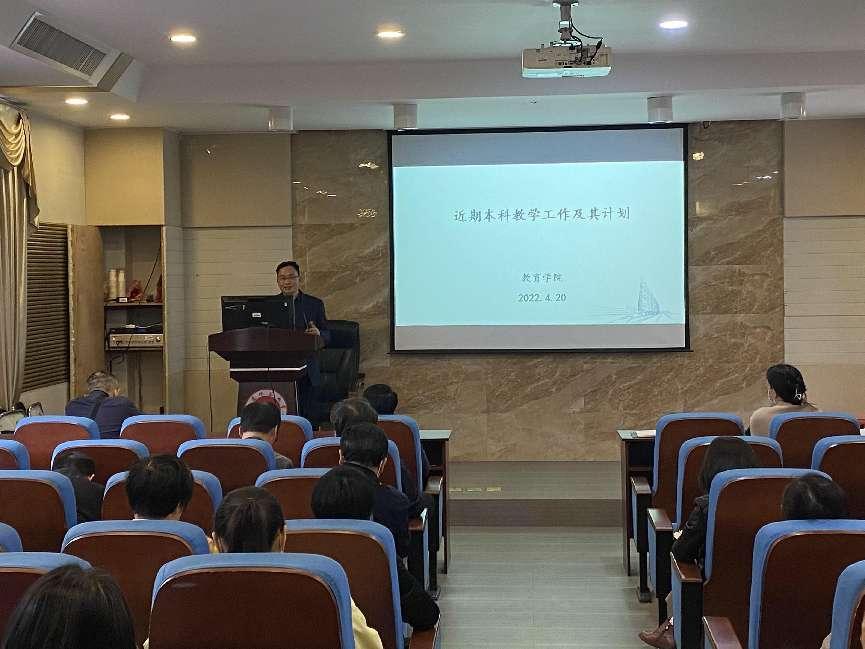 紧接着,殷世东副院长对近期本科教学工作及其计划做了全面梳理和汇报。首先,针对本学期教学工作他强调,要做好本科毕业论文各项指导工作,要做好上学期末课程考核归档工作,要做好实习工作总结材料归档工作,要做好线下与线上同步教学的预案,要开展期中教学各项工作自查工作。其次,在本学期本科教学工作的思考中他强调,要加大专业整改与建设力度——分类分步整改与建设;要加强教学研究院队建设——教研团队与教研室建设;要加强本科课程教材建设——分类分层次改革与建设;要深化本科课堂教学改革——加强教学研究与成果提炼。最后,在其他方面的思考,他提到要做好教育搬迁与规划准备工作,要做好教育学院未来规划与准备工作,要做好教育学院本科教学工作量的摸底等。